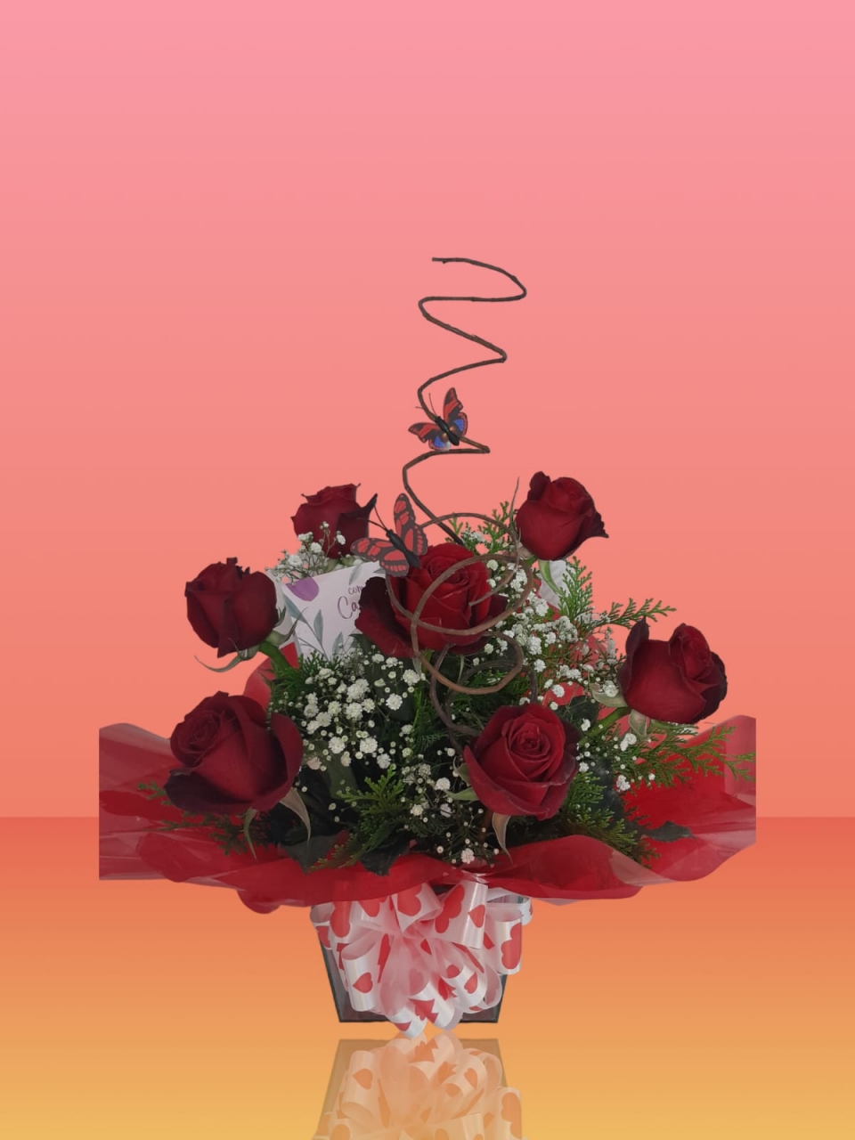 Arranjo com 7 rosas vermelhas, tango e miosótis, no vaso de vidro