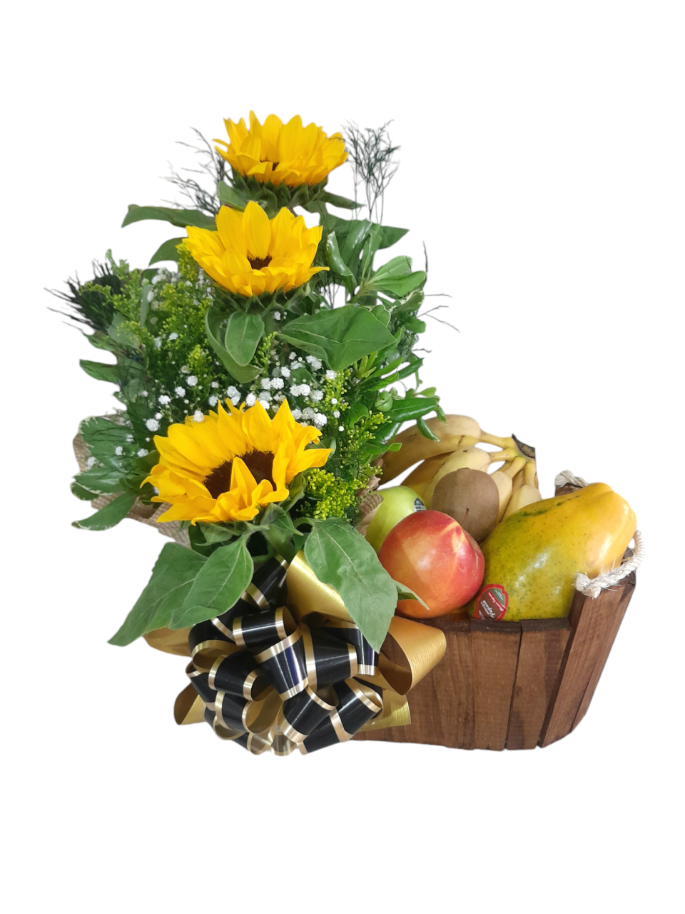 TINA DE MADEIRA COM ARRANJO COM 3 GIRASSOIS E FRUTAS