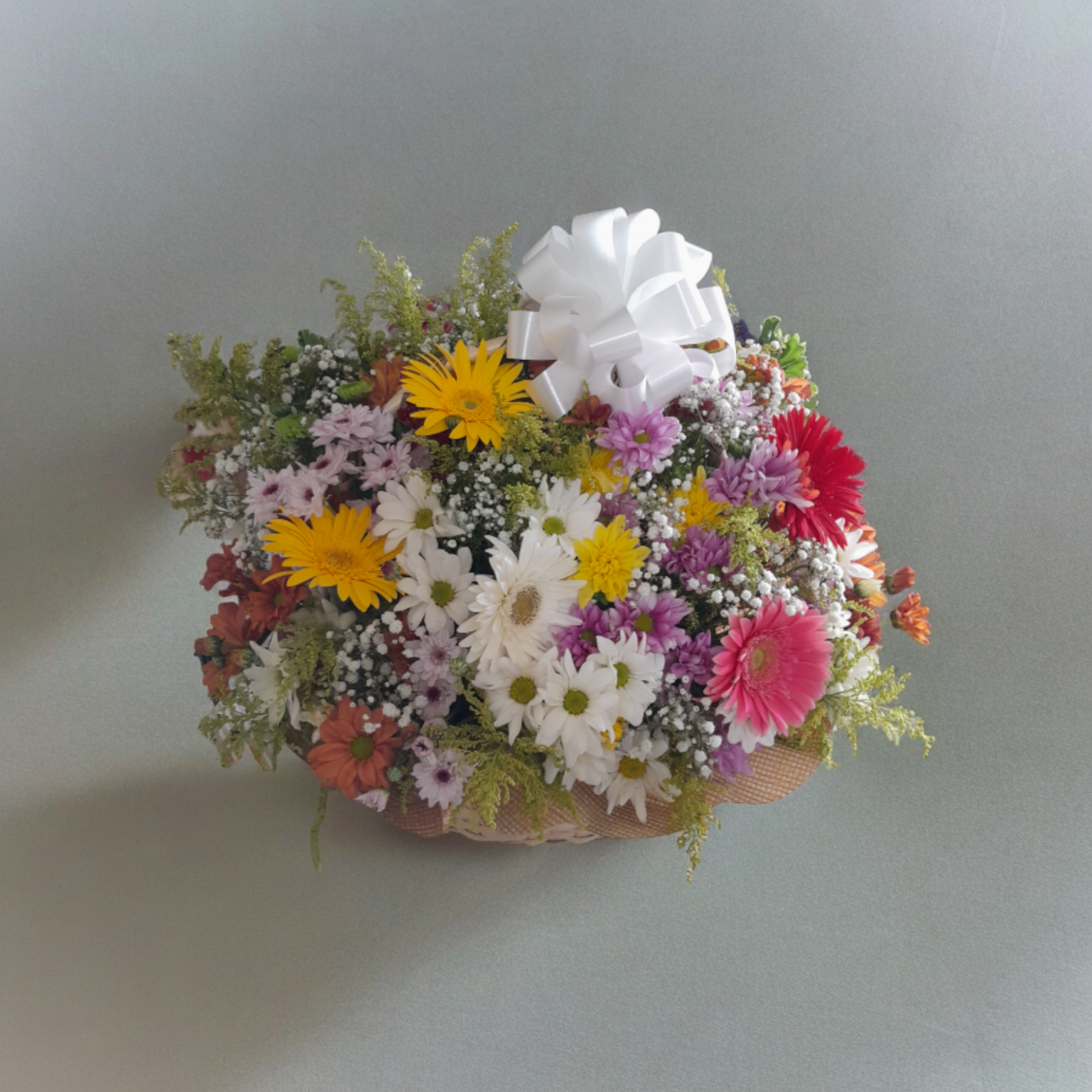 Cesta de flores do campo com rosas brancas, tango e miosótis