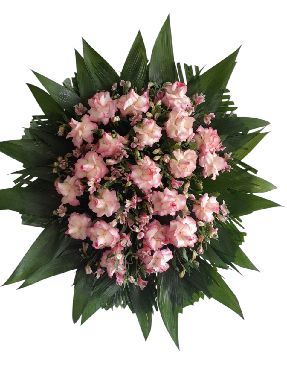 COROA DE ROSAS NA COR ROSA COM ASTROMELIAS ROSAS.
